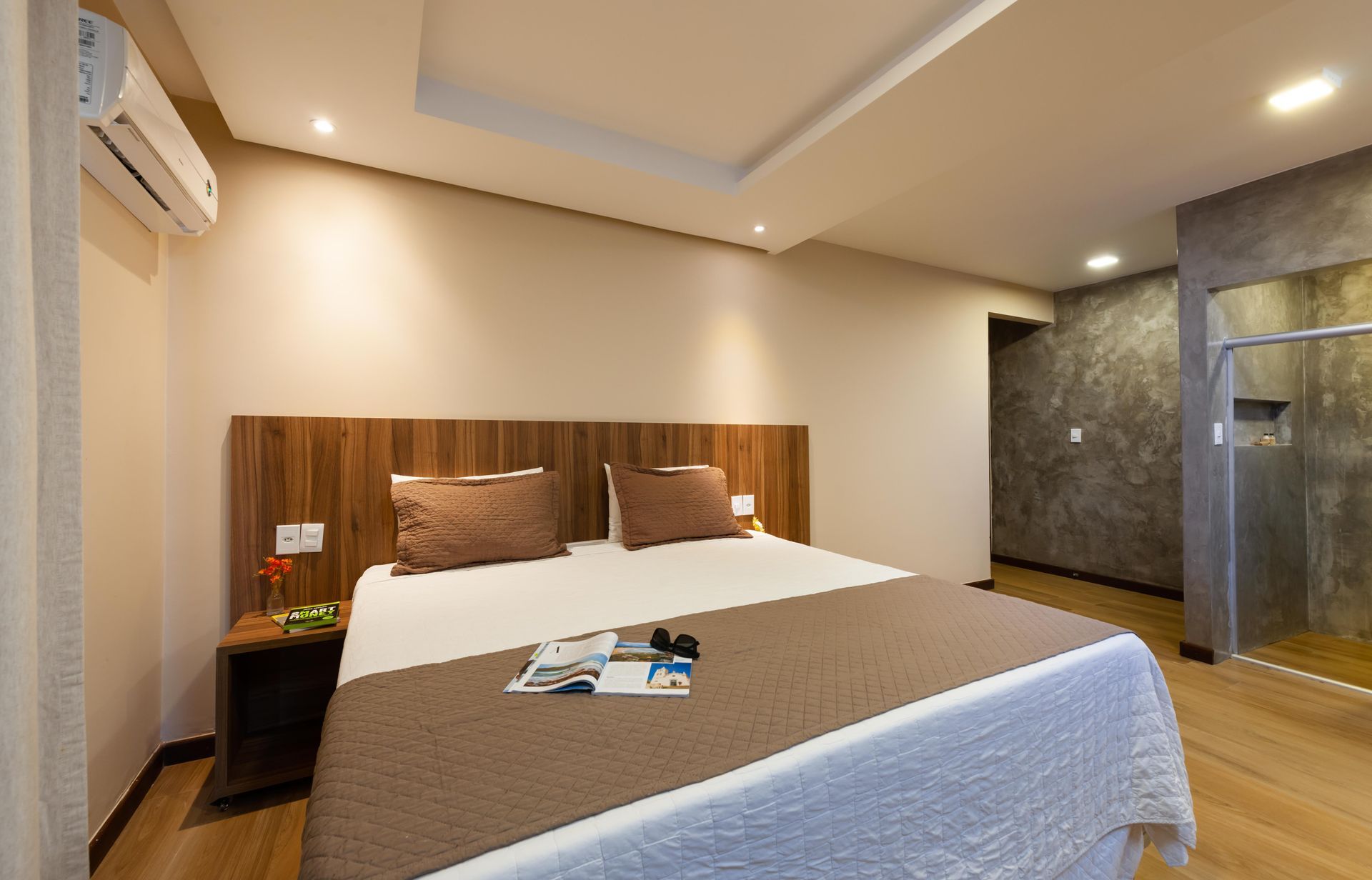 Projetado para uma ou duas pessoas, conta com cama box de casal e uma atmosfera leve, ideal para quem valoriza bem-estar e praticidade.