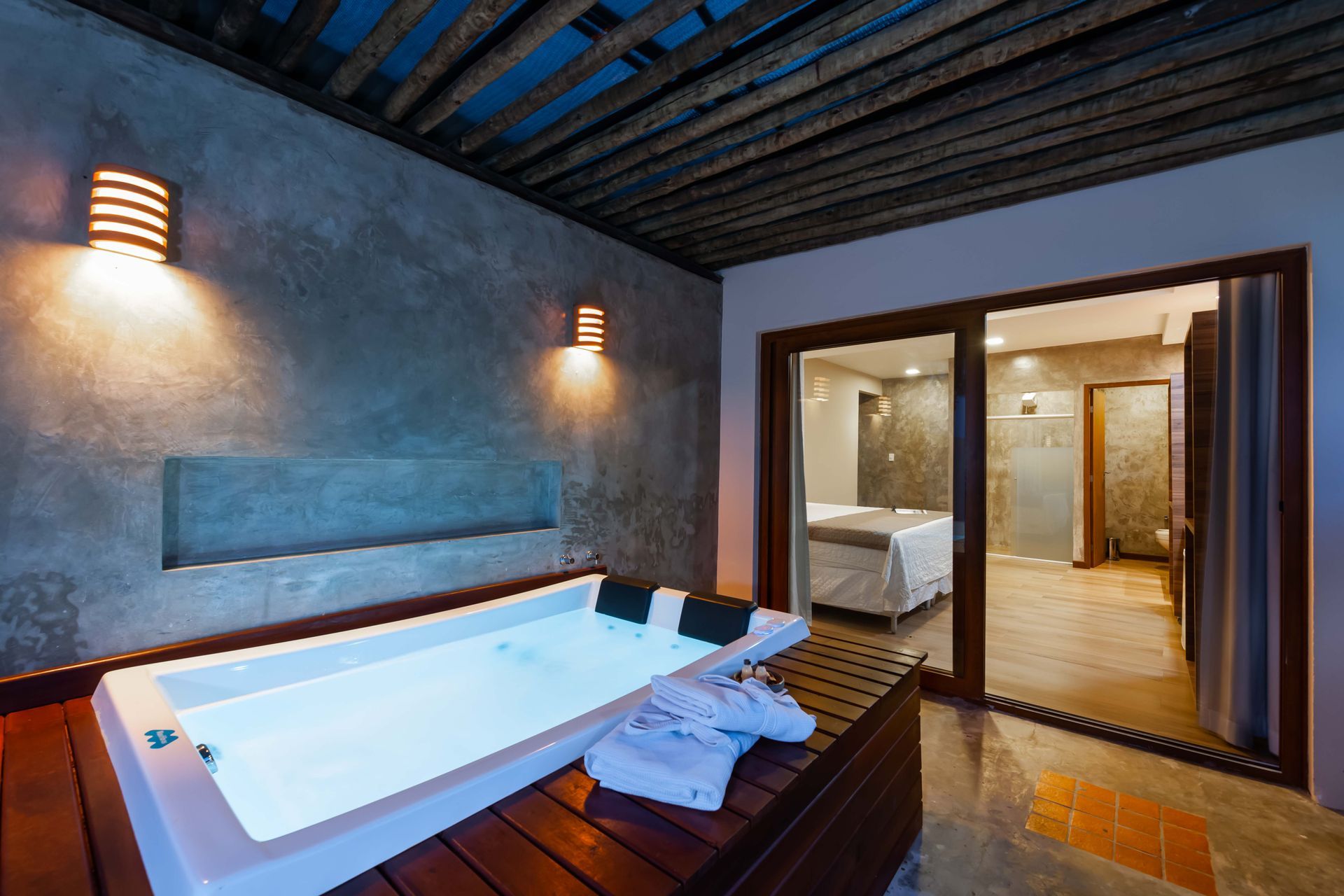 No terraço privativo, espreguiçadeiras e uma banheira de hidromassagem com sais de banho criam o cenário perfeito para momentos de puro descanso.